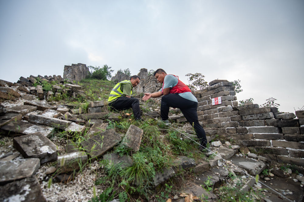 技工楊戰傑(右)在指導工人拉線劃設北京箭扣長城研究性修繕考古發掘範圍(2022年8月17日攝)。新華社記者 陳鍾昊 攝