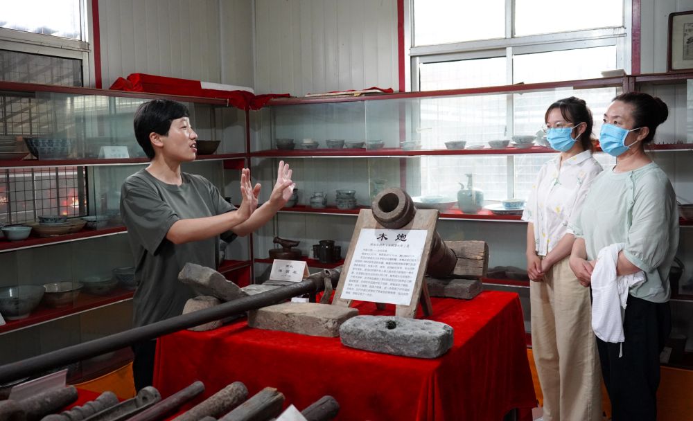 在秦皇島市海港區的長城文化展館,長城保護員李翠(左一)向遊客介紹長城文化知識(2021年7月8日攝)。新華社記者 金皓原 攝