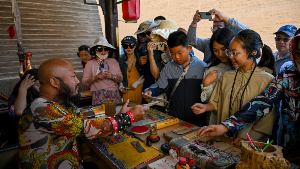 在甘肅嘉峪關(guan) 關(guan) 城景區,網紅“關(guan) 長”李森(左)為(wei) 遊客奉上自己手寫(xie) 好的文創產(chan) 品“關(guan) 照”(2023年7月14日攝)。新華社記者 劉金海 攝