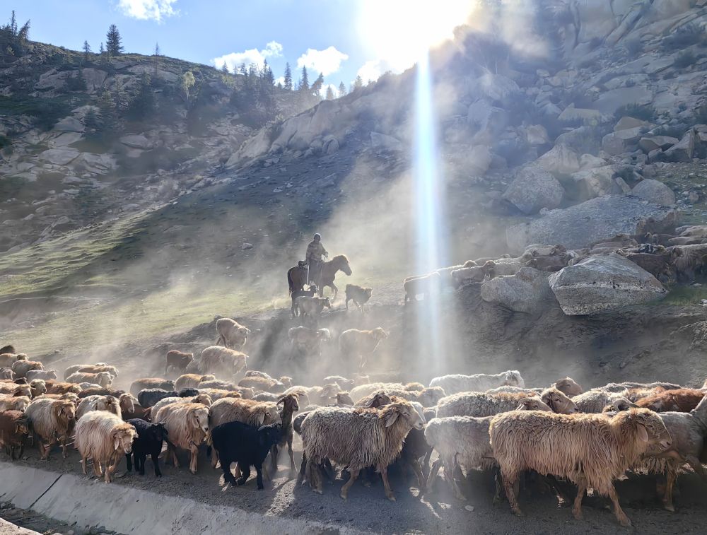 這是6月5日拍攝的新疆阿勒泰地區富蘊縣山中的羊群。新華社記者 楊皓 攝