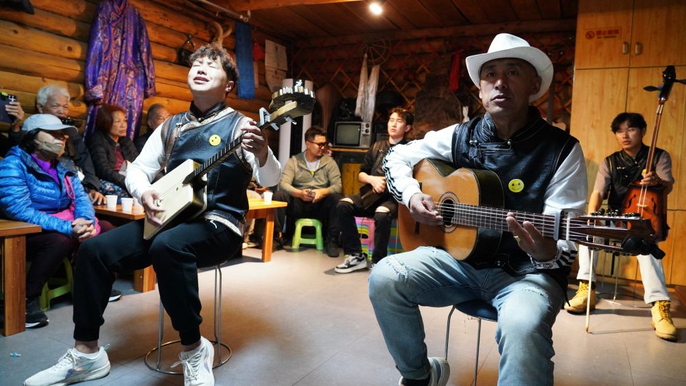 6月2日,在新疆喀納斯景區家訪點,樂(le) 隊歌手為(wei) 遊客演唱。新華社記者 阿曼 攝