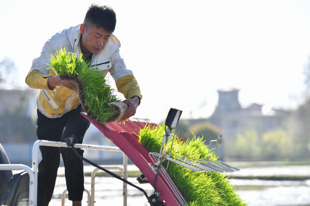 2024年3月29日,在湖南省長沙市望城區高塘嶺街道沱市村,農(nong) 戶將秧苗放到插秧機上。新華社記者 陳澤國 攝