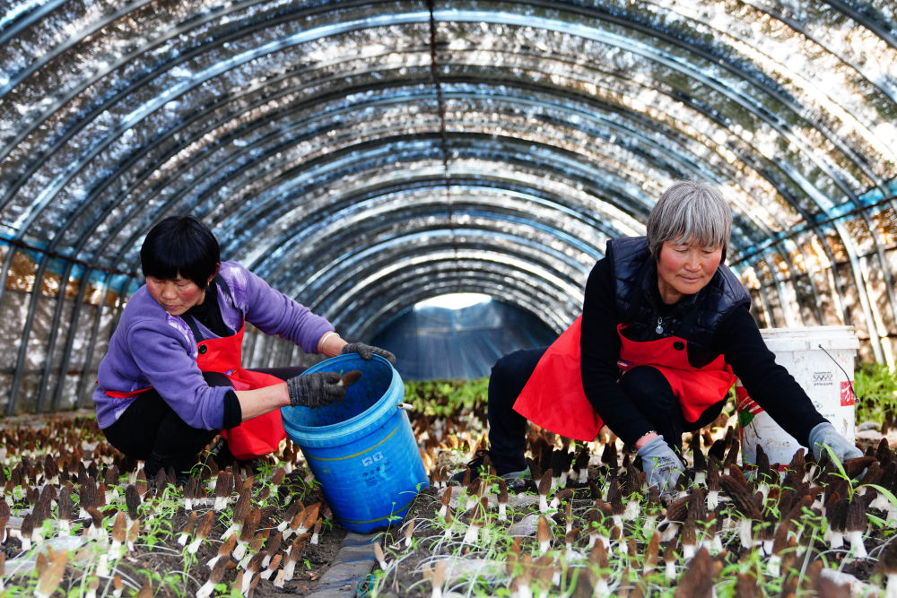 2024年3月20日,農(nong) 民在山東(dong) 省濟寧市微山縣驩城鎮袁堂華能光伏電站農(nong) 光互補項目的大棚裏采摘羊肚菌。該項目是采煤塌陷區綜合整治項目,集農(nong) 光互補、漁光互補於(yu) 一體(ti) 。新華社記者 郭緒雷 攝