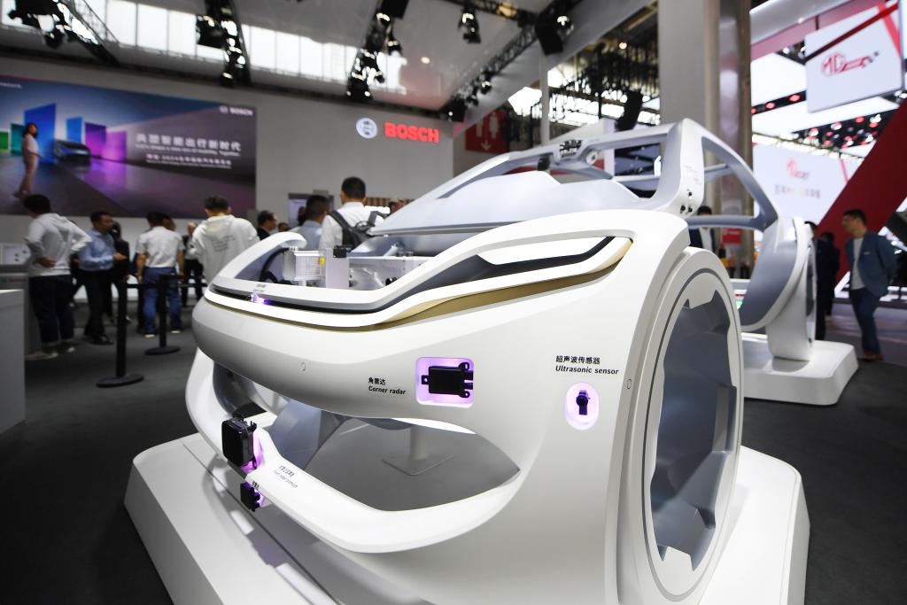 在北京車展上,博世公司展台展出可用於(yu) 新能源汽車智能出行解決(jue) 方案的相關(guan) 產(chan) 品(4月25日攝)。新華社記者鞠煥宗攝