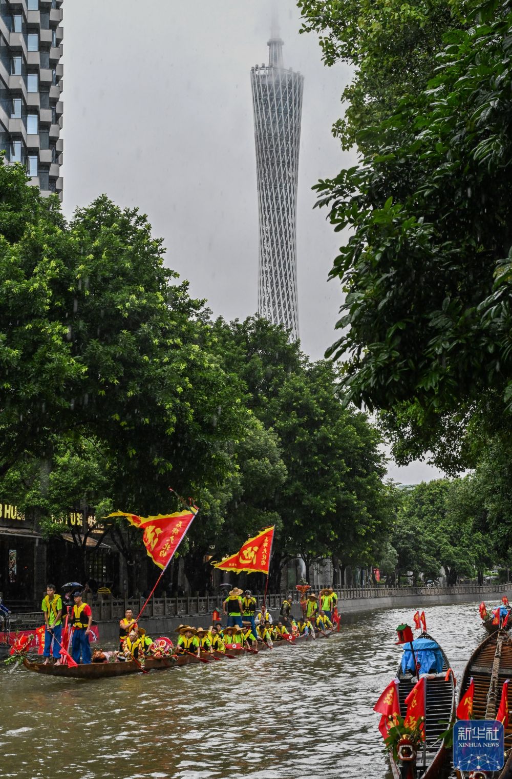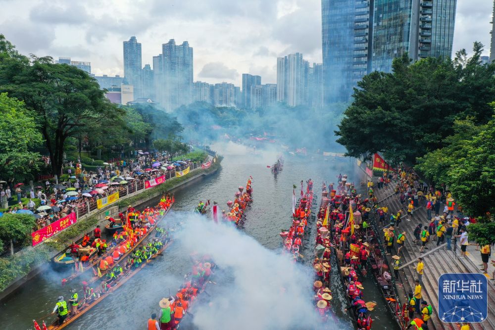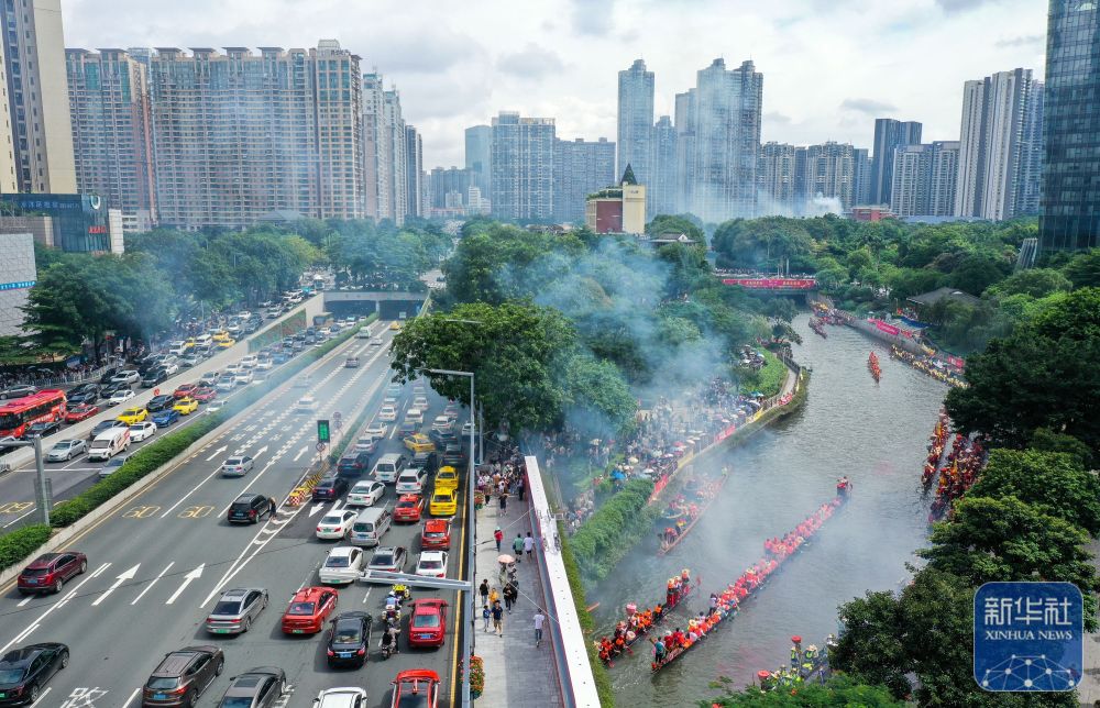 6月10日,獵德村熱鬧的傳(chuan) 統龍舟“龍船景”與(yu) 繁忙的現代都市交匯相融(無人機照片)。“龍船景”是廣府地區水鄉(xiang) 在端午期間舉(ju) 辦的一種民俗活動。新華社記者 劉大偉(wei) 攝