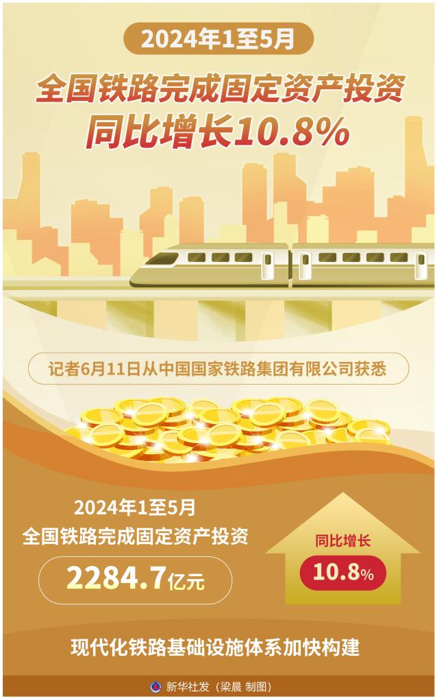 新華社北京6月11日電(記者樊曦、韓佳諾)記者11日從(cong) 中國國家鐵路集團有限公司獲悉,今年1至5月,全國鐵路完成固定資產(chan) 投資2284.7億(yi) 元,同比增長10.8%,現代化鐵路基礎設施體(ti) 係加快構建。