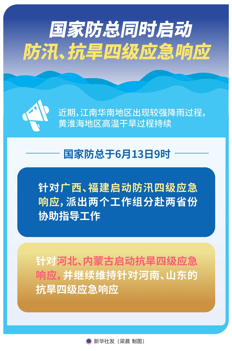 近期,江南華南地區出現較強降雨過程,黃淮海地區高溫幹旱過程持續。國家防總於(yu) 6月13日9時針對廣西、福建啟動防汛四級應急響應,派出兩(liang) 個(ge) 工作組分赴兩(liang) 省份協助指導工作;針對河北、內(nei) 蒙古啟動抗旱四級應急響應,並繼續維持針對河南、山東(dong) 的抗旱四級應急響應。