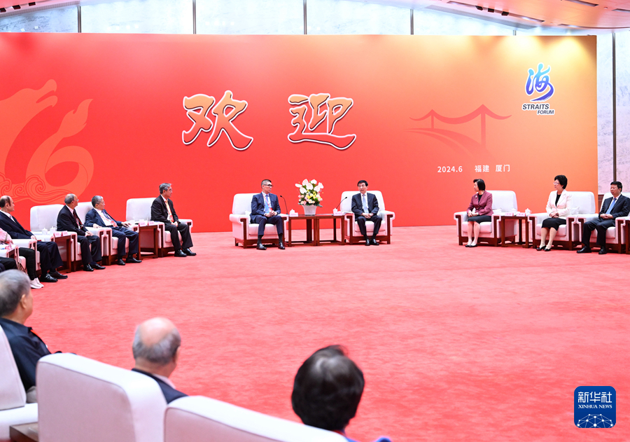 6月15日,第十六屆海峽論壇大會(hui) 在廈門舉(ju) 行。中共中央政治局常委、全國政協主席王滬寧出席並致辭。這是大會(hui) 開始前,王滬寧會(hui) 見參加論壇的台灣嘉賓代表。新華社記者 申宏 攝