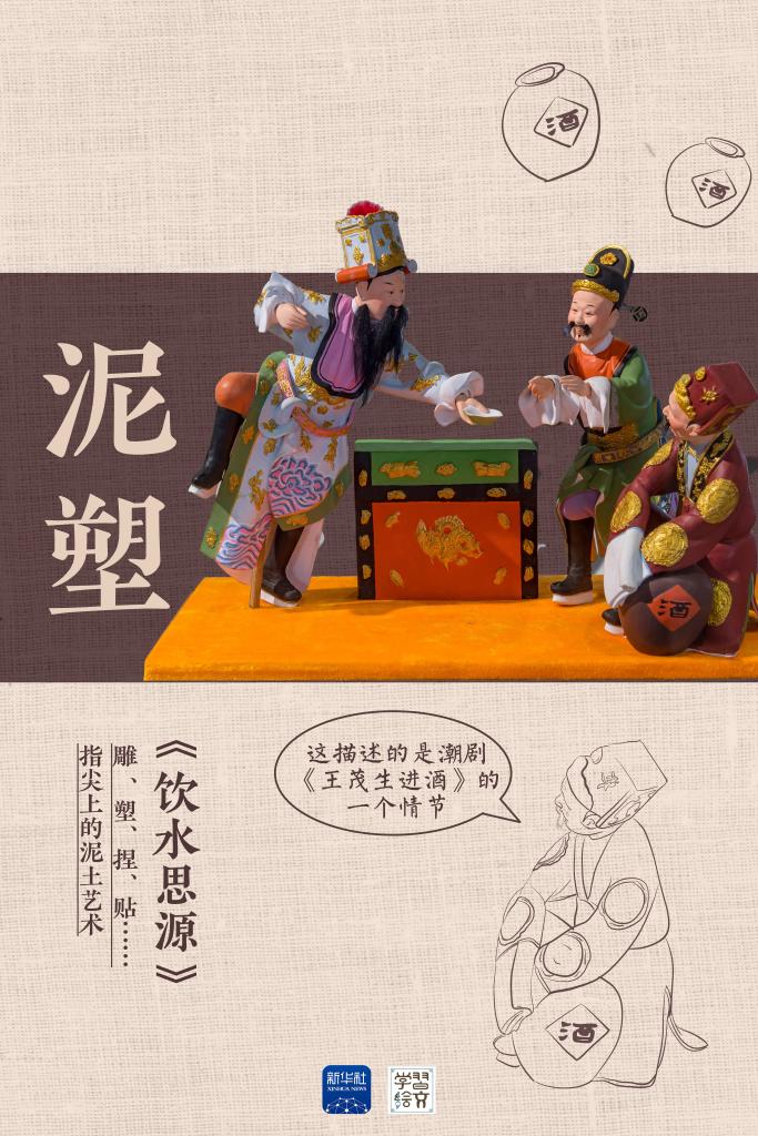 眼前這件泥塑作品,人物神形兼備。以戲劇故事人物組合為(wei) 主,“塑”說著戲台史書(shu) 上的悲歡離合。潮州泥塑最大特點是貼塑,匠人先製作好泥人,然後再給它做衣服,壓泥成片、褶片成衣,將衣服一層層給泥人“穿”到身上,使人物立體(ti) 而有質感,最終達到“活起來”的效果。