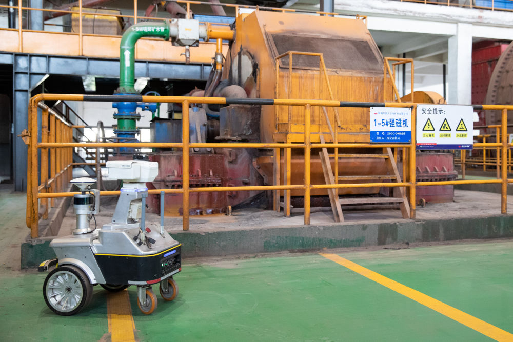 生產(chan) 現場無人化,依靠什麽(me) 來實現?步入磨磁車間,巨大的轟鳴聲在這個(ge) 長約100米、寬約50米、高約30米的廠房內(nei) 回響。登上二樓作業(ye) 平台,兩(liang) 台直徑6.2米的大型球磨機上的轉輪正在飛速旋轉。不遠處,磨磁巡檢機器人閃爍著燈光,正在采集設備溫度、振動等狀態數據。