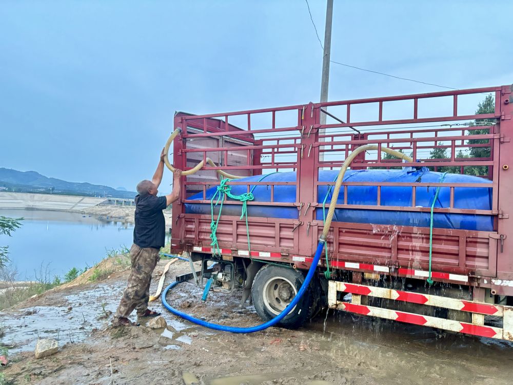 2024年6月11日,山東(dong) 省臨(lin) 沂市蒙陰縣野店鎮,村民從(cong) 水庫中抽水後前往果園灌溉。新華社記者高天 攝
