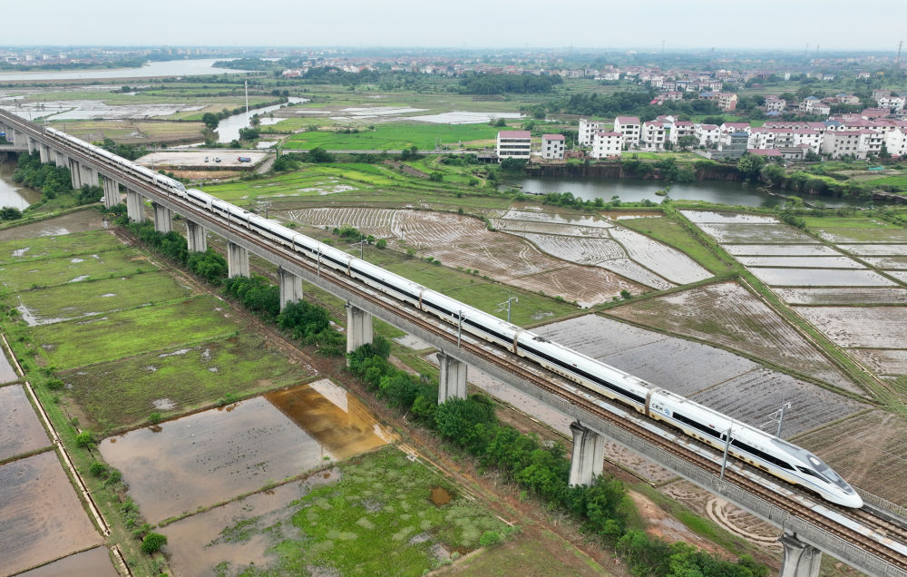 一輛高鐵列車從(cong) 位於(yu) 江西省鷹潭市的田野間駛過(無人機照片,6月4日攝)。新華社記者 萬(wan) 象 攝