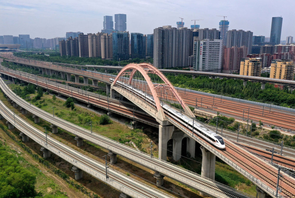 一列動車組列車行駛在鄭州東(dong) 站附近的線路上(5月30日攝)。新華社記者 李安 攝