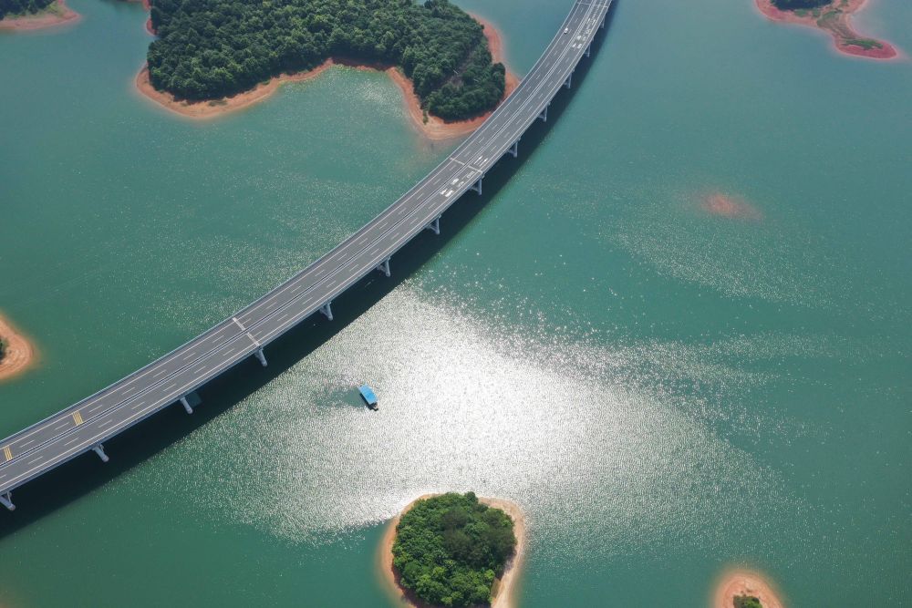 這是位於(yu) 江西省九江市永修縣與(yu) 武寧縣交界處的廬山西海與(yu) 跨過水麵的永武高速公路(無人機照片,6月7日攝)。新華社記者 周密 攝