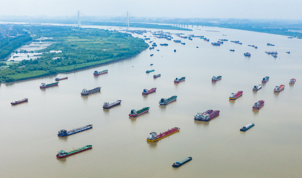2024年6月1日,船舶在湖北武漢市陽邏港區水域行駛(無人機照片)。新華社記者 杜子璿 攝
