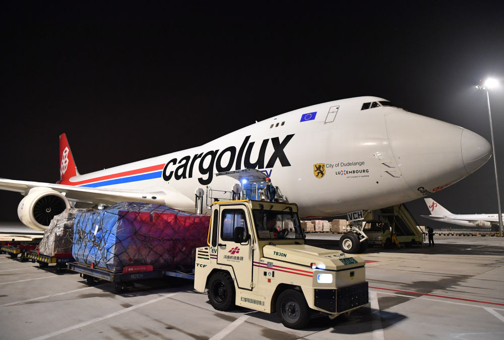 在鄭州新鄭國際機場,工作人員駕駛新能源拖車為(wei) 一架盧森堡貨航貨機卸貨(2023年8月1日攝)。新華社記者 李嘉南 攝