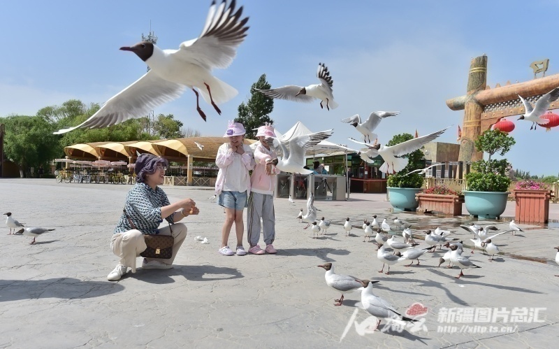 △6月15日,遊客在博斯騰湖景區與(yu) 海鷗互動。石榴雲(yun) /新疆日報記者 王立華攝