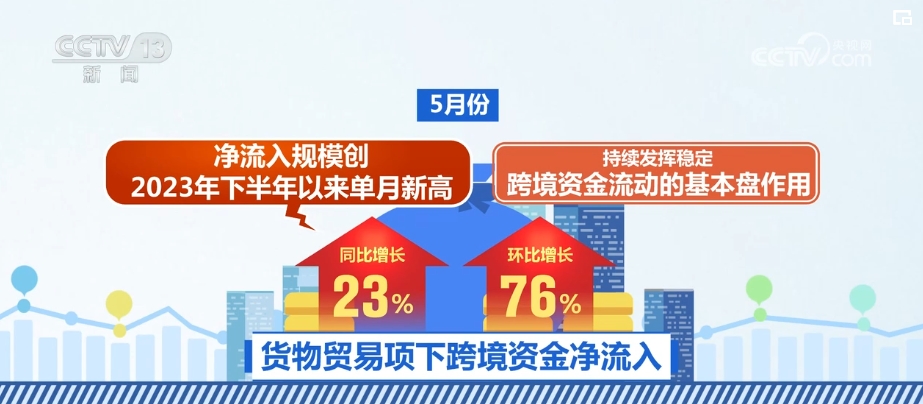5月份,貨物貿易項下跨境資金淨流入同比和環比分別增長23%和76%,淨流入規模創2023年下半年以來單月新高,持續發揮穩定跨境資金流動的基本盤作用。同時,外資配置人民幣資產(chan) 意願較強,5月份,淨買(mai) 入境內(nei) 債(zhai) 券320億(yi) 美元,環比增長86%,處於(yu) 曆史較高水平。此外,境內(nei) 主體(ti) 對外各類投資更加平穩有序。