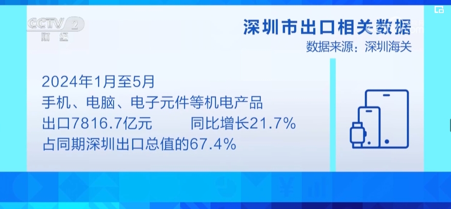 2024年前5個(ge) 月,深圳市出口總額達1.16萬(wan) 億(yi) 元,同比增長37.2%。其中,手機、電腦、電子元件等機電產(chan) 品出口7816.7億(yi) 元,同比增長21.7%,占同期深圳出口總值的67.4%。