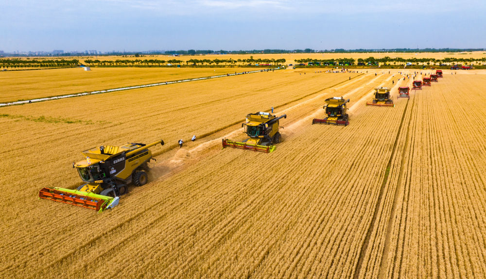 5月29日,在河南省駐馬店市西平縣老王坡高標準農(nong) 田,當地種糧大戶聯合農(nong) 機合作社舉(ju) 行小麥開鐮收割儀(yi) 式。這是機收編隊在收獲小麥。新華社發(趙永濤攝)
