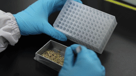 在湖南長沙的嶽麓山種業(ye) 創新中心,分子育種實驗室研究員李樂(le) 正在把脫殼的水稻種子放進樣品盤裏,隨後將樣品放置在全自動移液工作站上,進行樣品DNA的提取。該樣品是一份田間試驗的低鎘水稻種子,這是嶽麓山種業(ye) 創新中心受種業(ye) 企業(ye) 委托選育的品種。