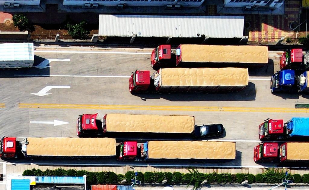 6月15日,在山東(dong) 省臨(lin) 沂市平邑縣一處糧食儲(chu) 備庫夏糧收購現場,運輸車輛排隊售糧(無人機照片)。新華社發(武紀全 攝)