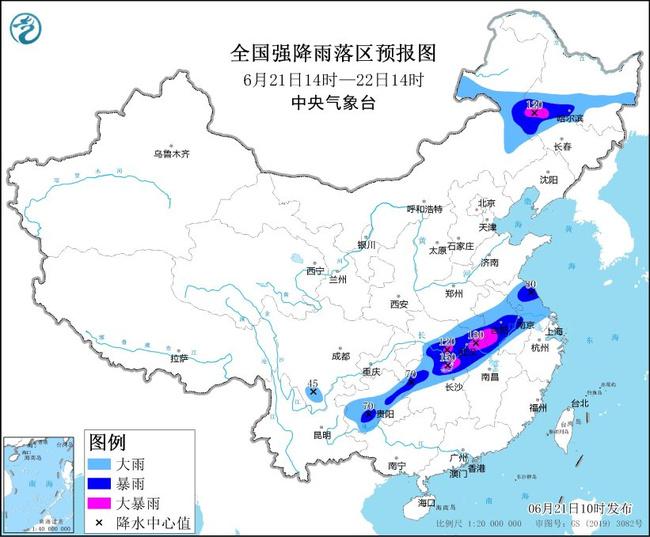 預計,6月21日14時至22日14時,貴州中南部、湖南北部、湖北東(dong) 部和南部、河南東(dong) 南部、江西西北部、安徽、江蘇以及內(nei) 蒙古東(dong) 部、黑龍江南部、吉林西北部等地部分地區有大到暴雨,其中,安徽中部、湖北東(dong) 部和南部、湖南東(dong) 北部、內(nei) 蒙古東(dong) 部、黑龍江西南部、吉林西北部等地局地有大暴雨(100~180毫米)。上述部分地區伴有短時強降水(最大小時降雨量30~50毫米,局地可超過80毫米),局地有雷暴大風等強對流天氣。