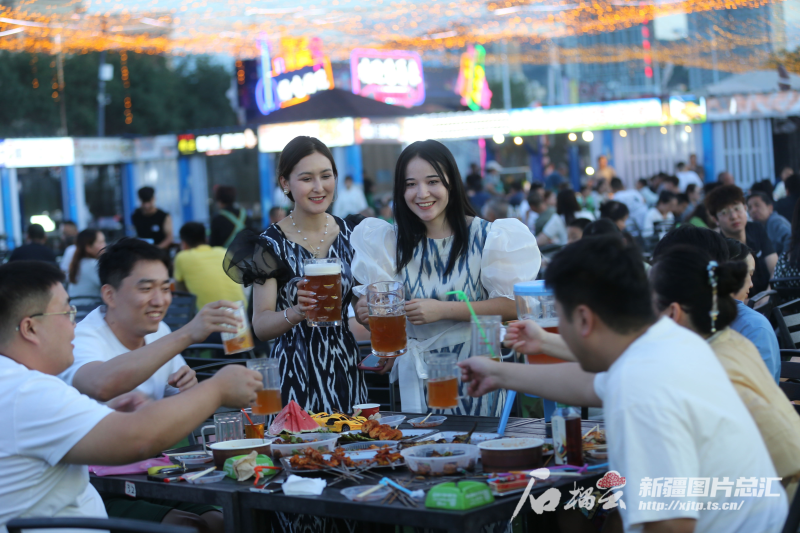 6月18日,市民在烏(wu) 魯木齊華淩夜市品嚐美食。 石榴雲(yun) /新疆日報記者 李雄心攝