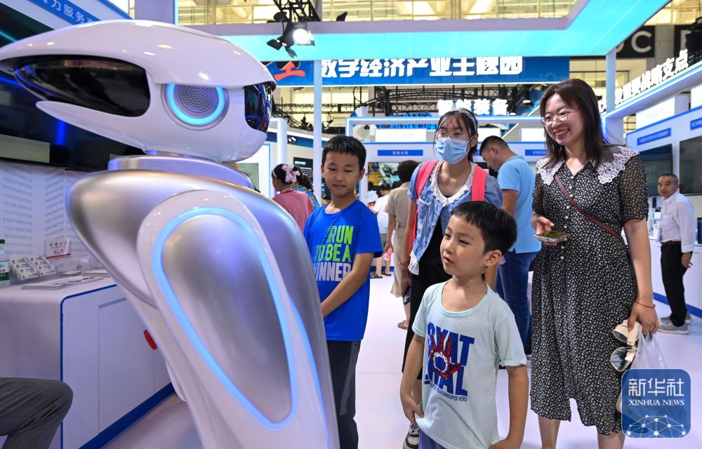 6月21日,參觀者在博覽會(hui) 上和一款機器人互動。