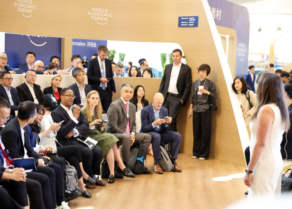 6月26日,在夏季達沃斯論壇主會(hui) 場大連國際會(hui) 議中心,嘉賓交流討論。新華社記者李鋼攝