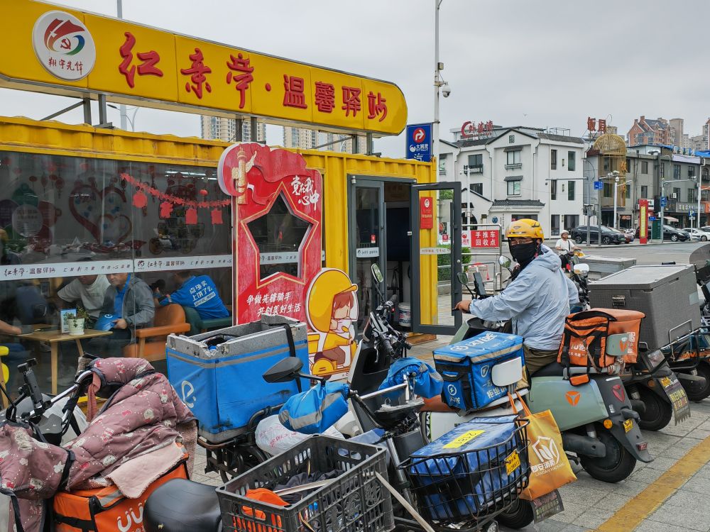 空調、微波爐、藥箱……記者在江蘇淮安經濟技術開發區大潤發超市旁的溫馨驛站發現,這裏空間不大,但功能齊全。不時有騎手進出,在此短暫休息、補水、給手機充電、閑聊。