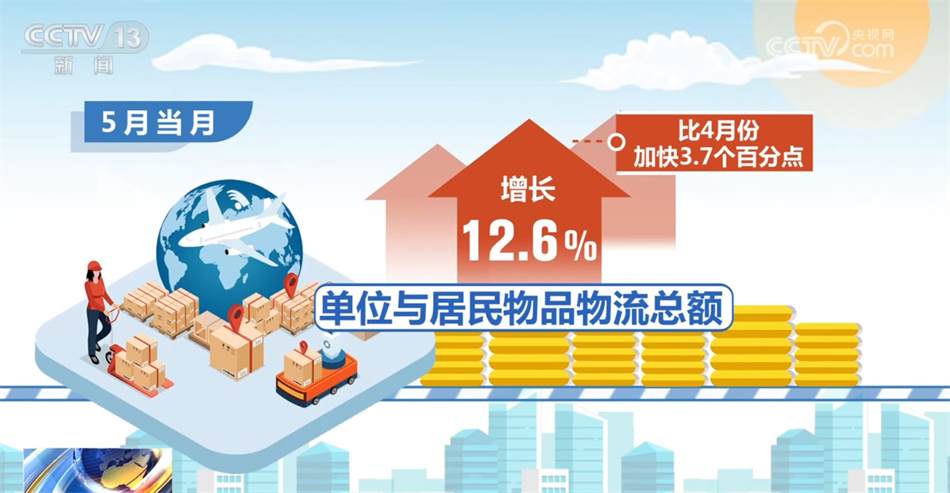 另外,民生消費領域物流需求增速有所加快。1—5月份,單位與(yu) 居民物品物流總額同比增長11.4%,增速比1—4月份提高0.4個(ge) 百分點。特別是5月份以來,在假期效應、電商促銷以及消費品以舊換新政策等因素帶動下,與(yu) 民生消費相關(guan) 的物流需求回升明顯,5月當月單位與(yu) 居民物品物流總額增長12.6%,比4月份加快3.7個(ge) 百分點。
