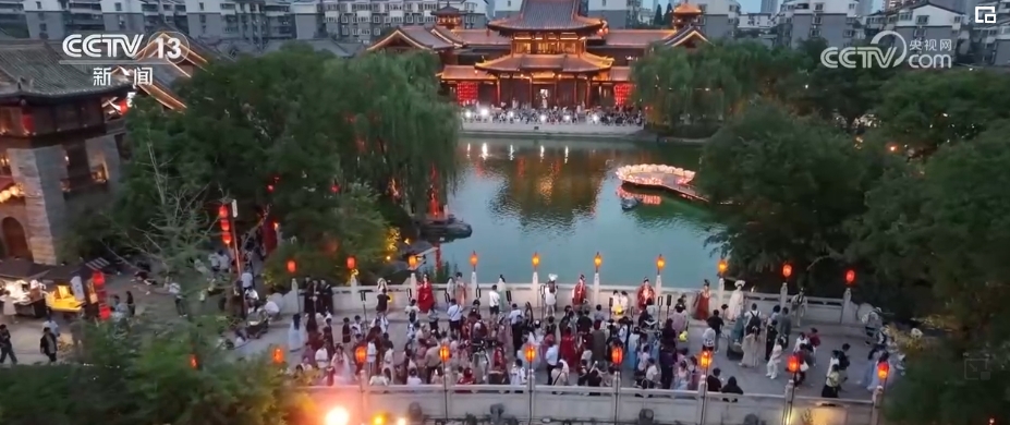 著華服、綰青絲(si) 、點朱丹……夜幕降臨(lin) ,新潭遺址之上建起的洛邑古城內(nei) 人頭攢動。精心妝造過的古裝佳人或倚窗凝思,或憑欄望月,置身其中,仿佛穿越時空,美不勝收。