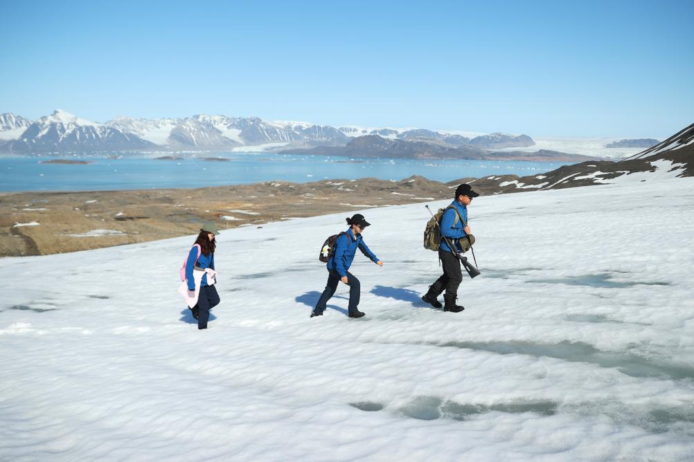 圖為(wei) 2024年6月22日,在挪威新奧勒鬆,科考隊員胡正毅(右)、趙紅穎(中)、武小涵外出進行采樣工作。(新華社記者趙丁喆攝)
