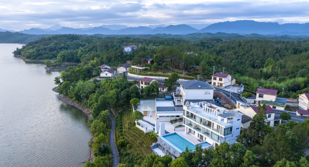 這是江西省武寧縣修河畔“一渡一山海”民宿群,一些返鄉(xiang) 農(nong) 民在這裏受聘為(wei) 民宿管家(2024年6月3日攝,無人機照片)。新華社發(梁振堂 攝)