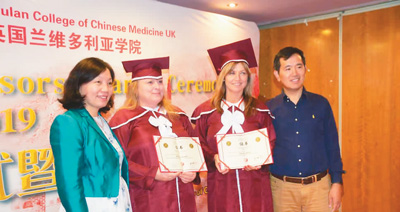 二〇二二年,英國蘭(lan) 中醫學院畢業(ye) 典禮。左一為(wei) 湯淑蘭(lan) 。