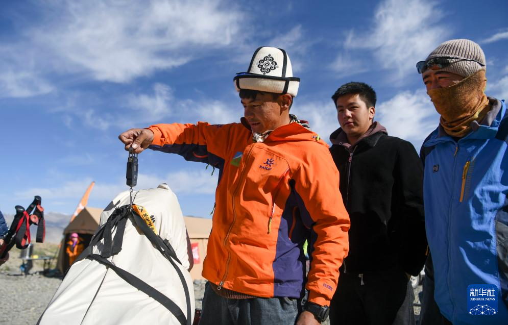 7月4日,在新疆慕士塔格峰一處登山營地,塔西巴伊(左)將登山者的物品稱重。高山搬運依據不同海拔路程對所背物品按重量收取費用。新華社記者 胡虎虎 攝