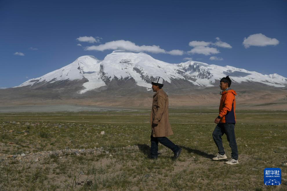 7月6日,塔西巴伊(右)和父親(qin) 加尼拜克路過慕士塔格峰腳下的牧場。新華社記者 胡虎虎 攝