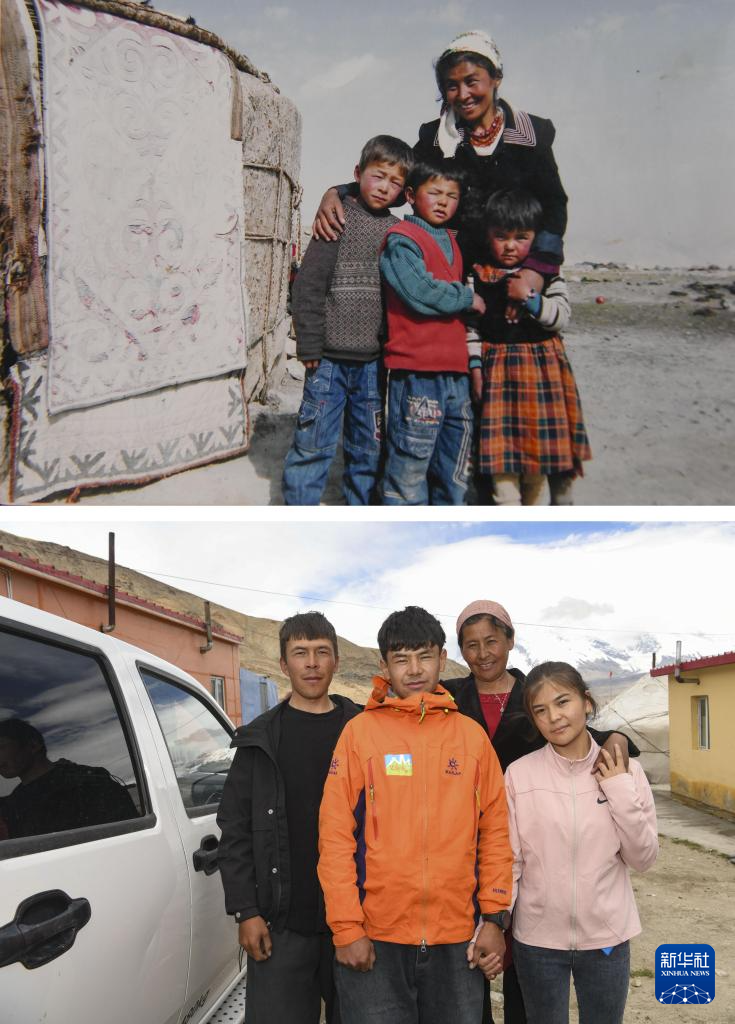 拚版照片:上圖為(wei) 國外登山隊於(yu) 2007年8月22日為(wei) 塔西巴伊(前中)、哥哥(前左)、妹妹(前右)、母親(qin) 在慕士塔格峰下牧場氈房旁拍攝的合影(7月5日翻拍資料照片);下圖為(wei) 2024年7月5日塔西巴伊(前中)、哥哥(前左)、妹妹(前右)、母親(qin) 在慕士塔格峰下新居前拍攝的合影(新華社記者胡虎虎攝)。新華社發