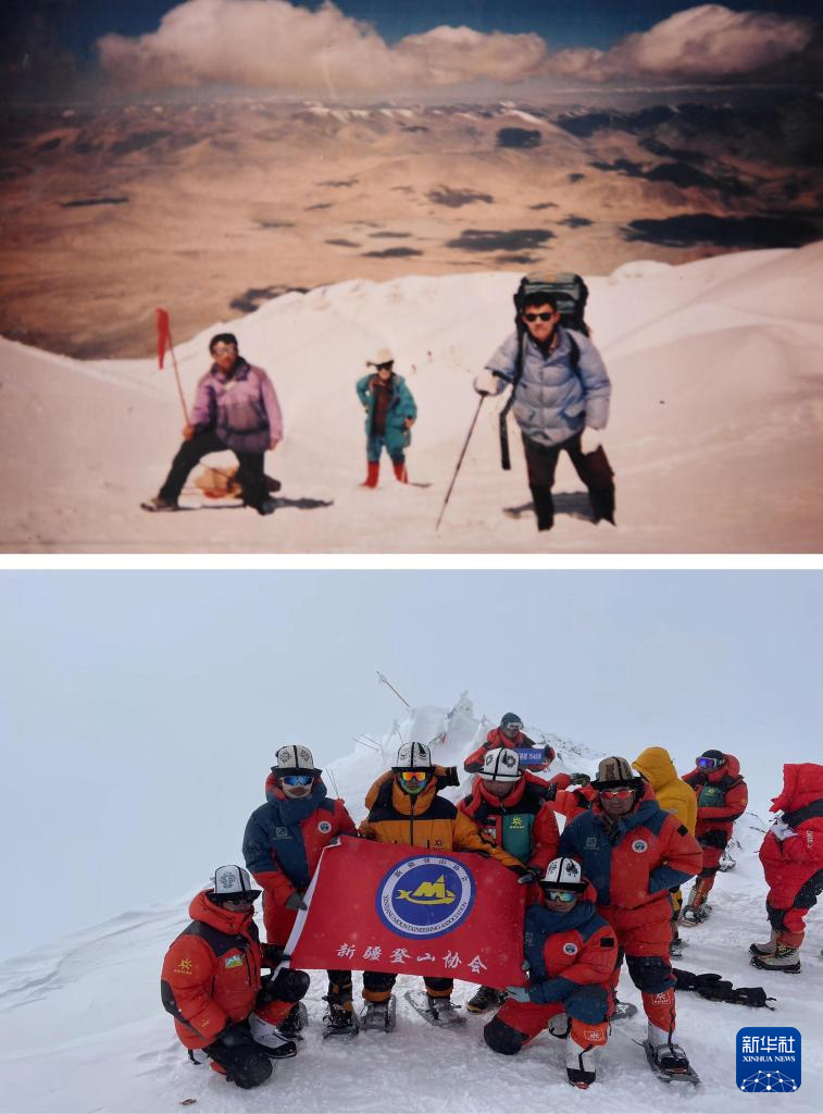 拚版照片:上圖為(wei) 父親(qin) 加尼拜克(左)與(yu) 其兄弟於(yu) 2004年8月6日一起為(wei) 國外登山隊服務時在慕士塔格峰上的合影(2024年7月5日翻拍資料照片,新華社記者胡虎虎攝);下圖為(wei) 兒(er) 子塔西巴伊(左三、黃衣者)和同伴於(yu) 2023年7月29日登頂慕士塔格峰時的合影(受訪者供圖)。新華社發