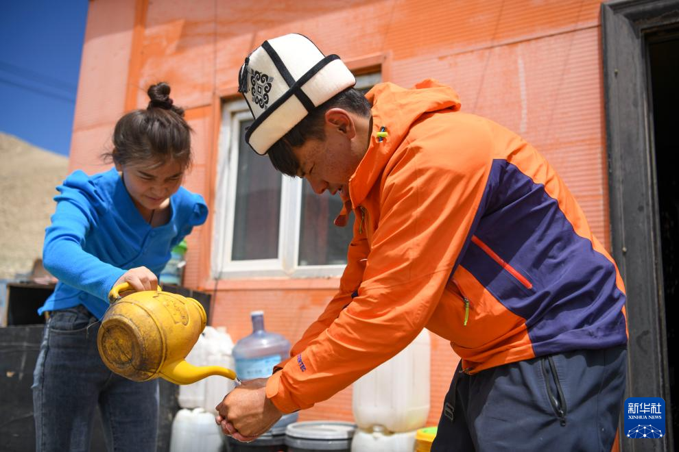 7月5日,塔西巴伊下山後回到家,妹妹為(wei) 其倒水洗手。新華社記者 胡虎虎 攝
