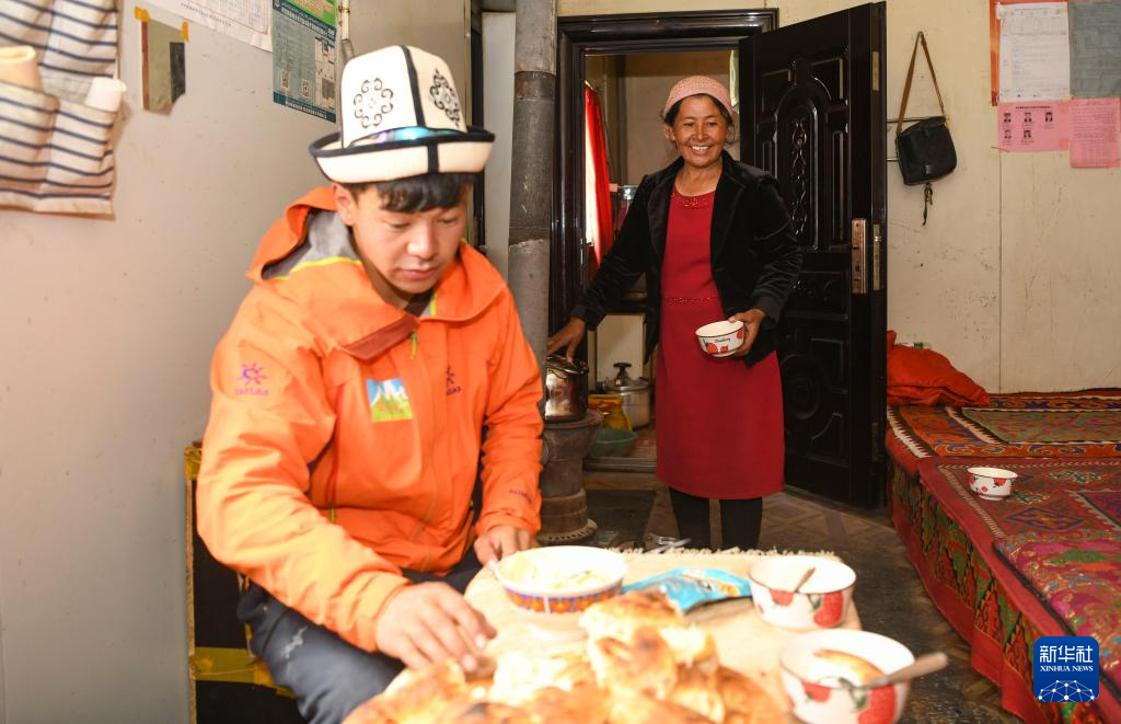 7月5日,塔西巴伊下山後回到家,母親(qin) 為(wei) 他準備了奶茶、饢、酸奶等美食。新華社記者 胡虎虎 攝