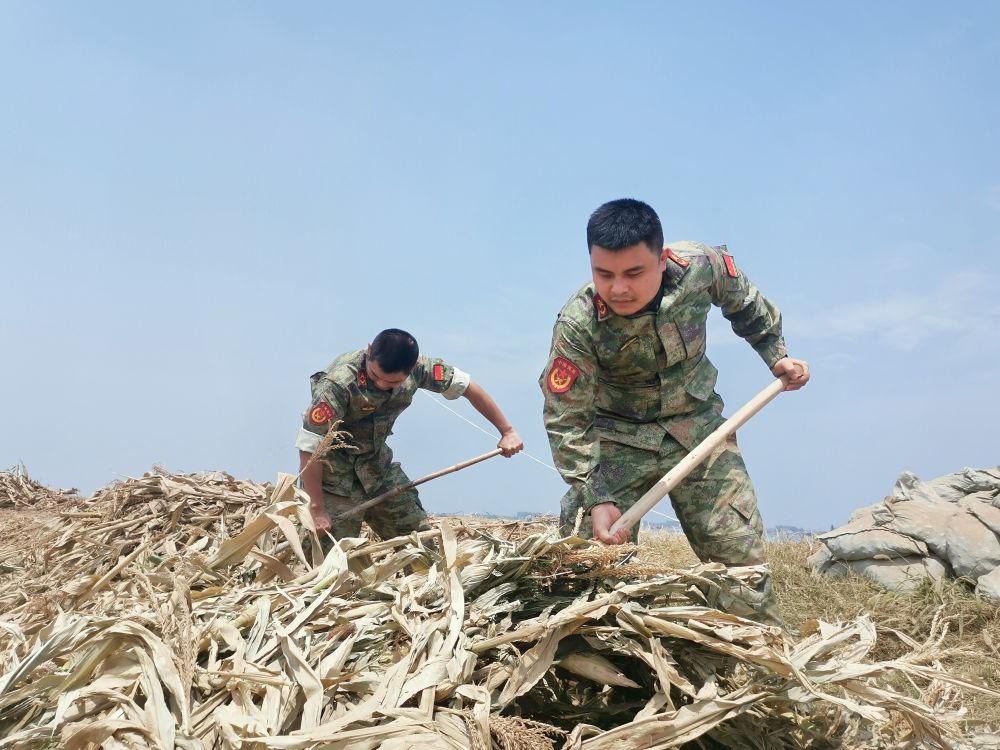 7月10日,冷濤(右)和隊友在錢團間堤上進行加固作業(ye) 。(肖騰 攝)
