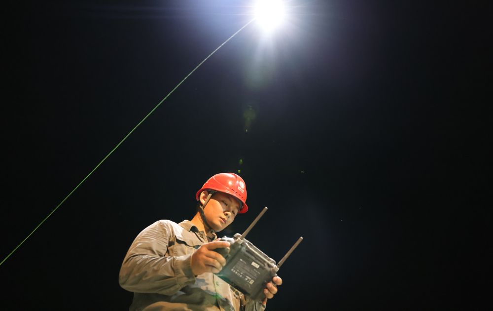 在堵口作業(ye) 現場,劉子翔負責操作係留式無人機,為(wei) 施工人員提供夜間照明。他時刻注意風向、風速,根據施工人員的需求,及時調整無人機的位置,確保“照得見、照得亮”。