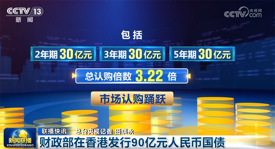 財政部7月10日在香港招標發行2024年第三期人民幣國債(zhai) ,發行規模為(wei) 90億(yi) 元,包括2年期、3年期、5年期各30億(yi) 元。總認購倍數3.22倍,市場認購踴躍。今年財政部在香港計劃發行550億(yi) 元人民幣國債(zhai) ,進一步完善常態化發行機製,支持鞏固提升香港國際金融中心地位。