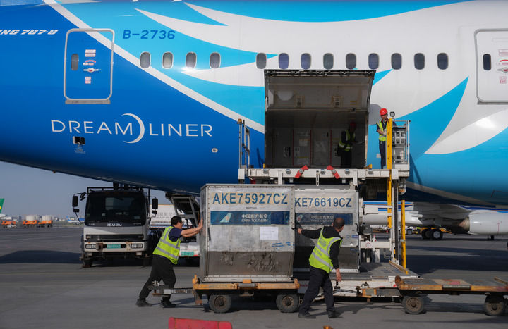 南航工作人員在烏(wu) 魯木齊地窩堡國際機場裝卸國際航班貨物(2024年4月28日攝)。新華社發(車捷 攝)