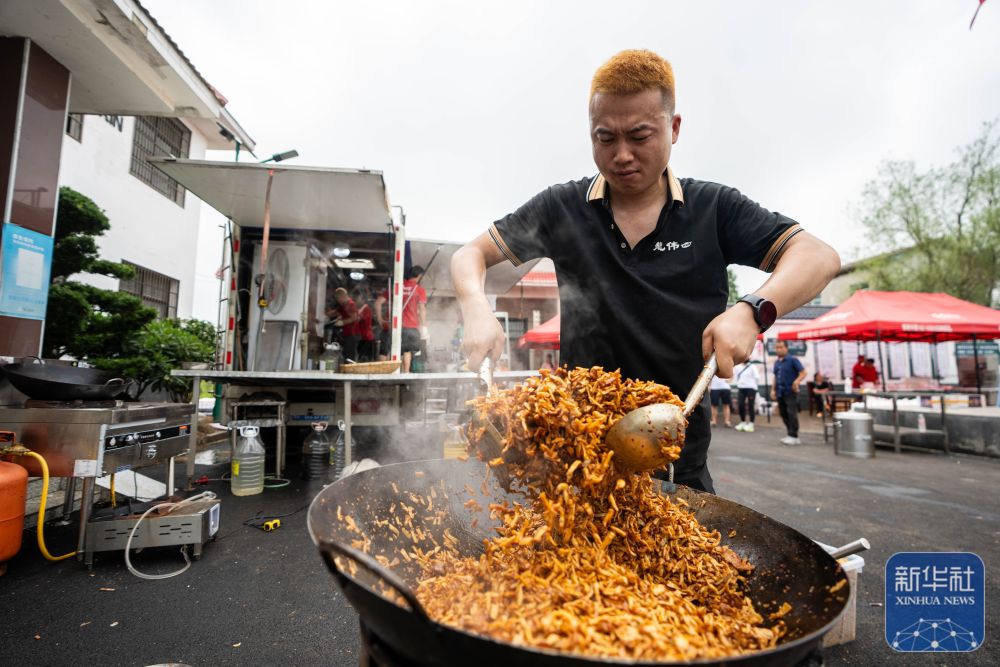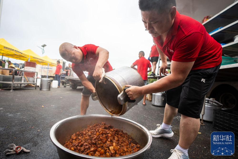 7月8日,在嶽陽市良心堡鎮望君洲村,誌願者在炒製菜肴。新華社記者 陳思汗 攝