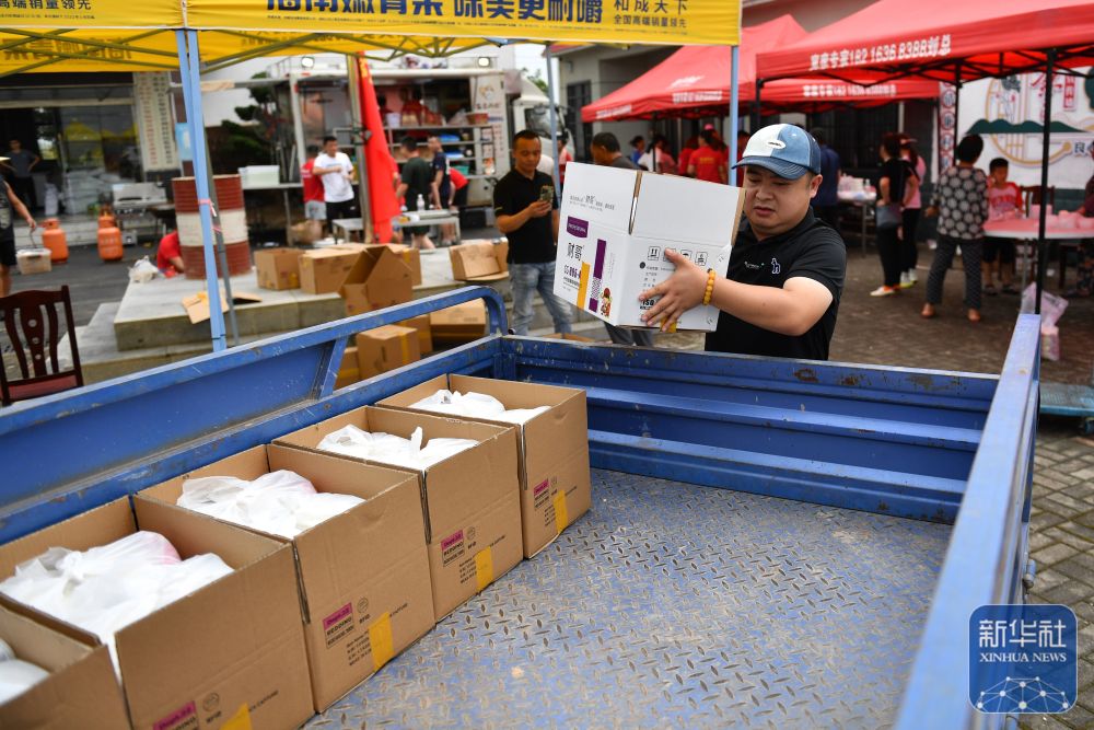 7月10日,在嶽陽市良心堡鎮望君洲村,誌願者在打包盒飯。新華社記者 陳思汗 攝