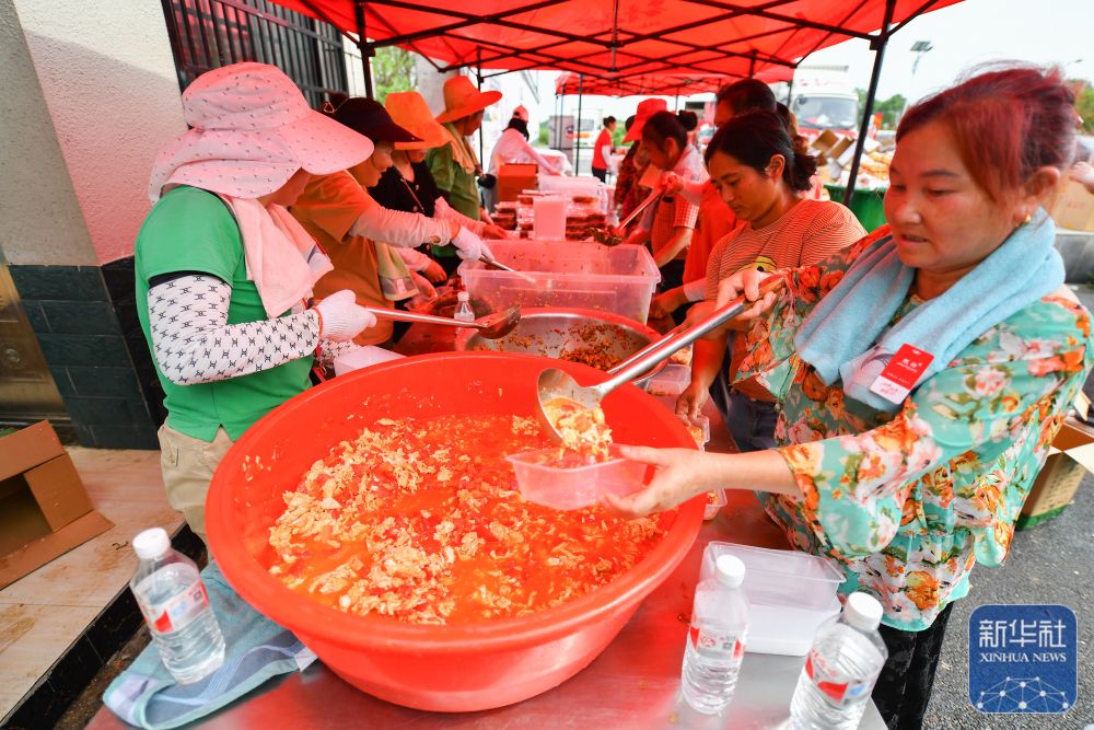 7月10日,在嶽陽市良心堡鎮望君洲村,誌願者在打包盒飯。新華社記者 陳振海 攝