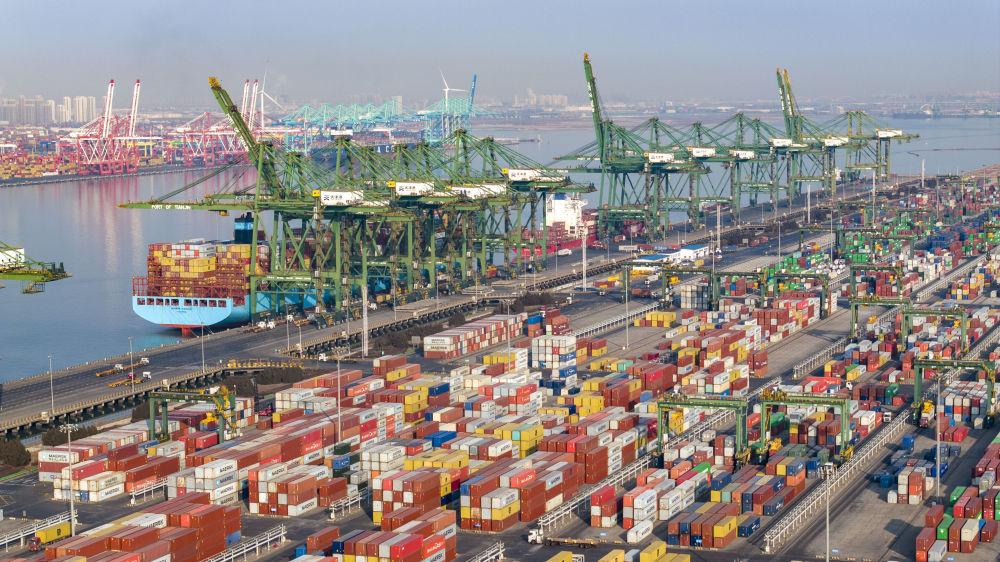 7月3日,一艘集裝箱貨輪停靠在天津港太平洋國際集裝箱碼頭(無人機照片)。新華社記者 趙子碩 攝
